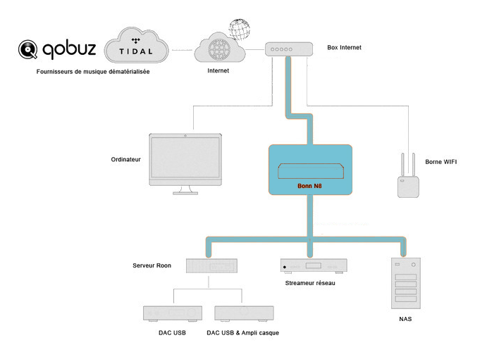 Les fabricants ne s'y sont pas trompés et au delà de 2400 €, ils ne proposent plus de lecteur réseau qui soit wi-fi. Ces réseaux sans-fil, y compris ceux qui fonctionnent sans aléa, ne permettent pas d'atteindre les meilleurs résultats sonores. Si vous souhaitez obtenir mieux, c'est-à-dire une meilleure dynamique, plus d'aération, de nuances etc...vous devrez obligatoirement être connecté à la box par une liaison filaire.