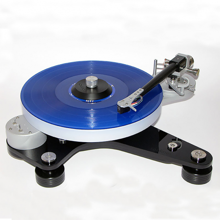 Cet agencement place le centre de gravité du bras juste en dessous du point de pivot et approximativement dans le même plan horizontal que le disque lui-même. Il en résulte un suivi presque parfait du sillon, offrant une réponse dynamique exemplaire et un son d’une neutralité absolue.