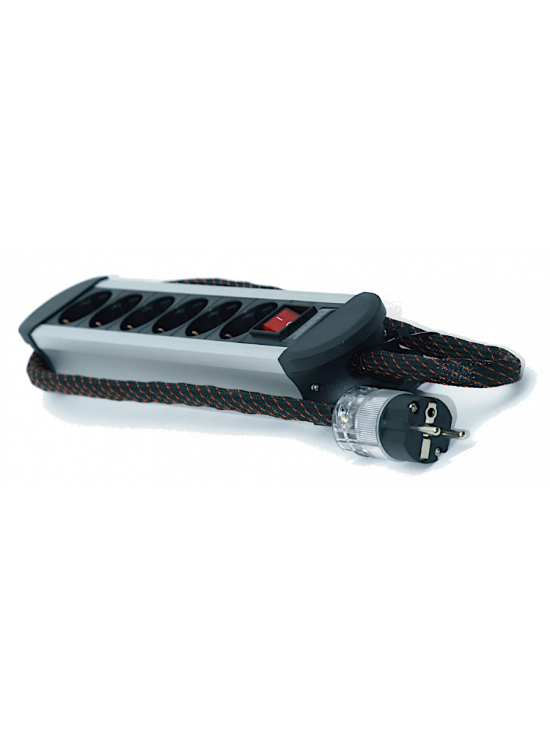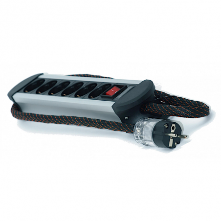 La barrette secteur TCI Constrictor est pourvue de 6 prises schuko dont les contacts sont en cuivre rouge. Son câble d'alimentation est captif, il est constitué de huit conducteurs plaqué argent de forte section, isolés par du téflon. Ce câble agit comme un filtre naturel contre la pollution électro-magnétique. Beaucoup de barrettes sont