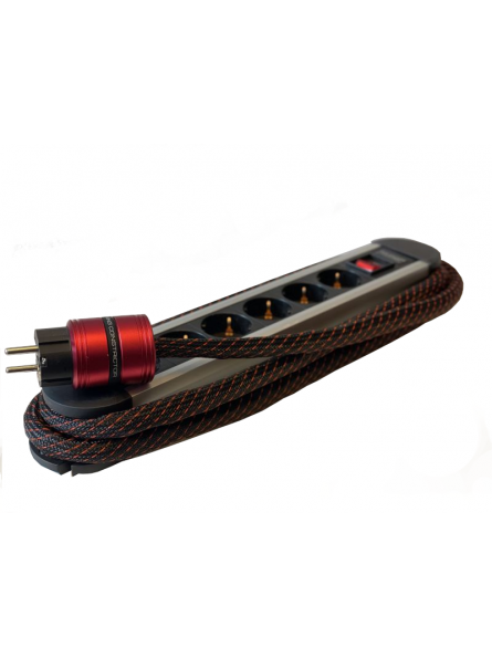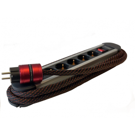 La barrette secteur TCI Constrictor est pourvue de 6 prises schuko dont les contacts sont en cuivre rouge. Son câble d'alimentation est captif, il est constitué de seize conducteurs plaqué argent de forte section, isolés par du téflon. Ce câble agit comme un filtre naturel contre la pollution électro-magnétique.
